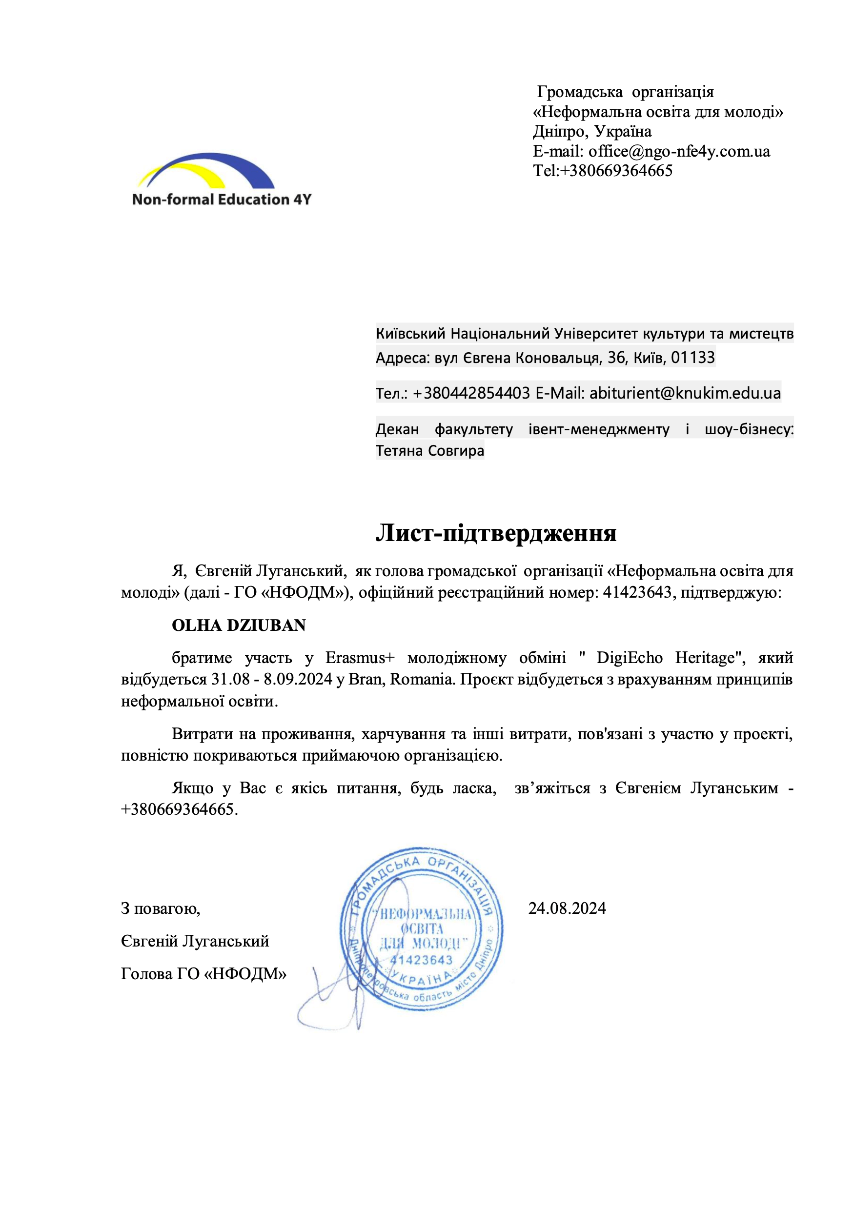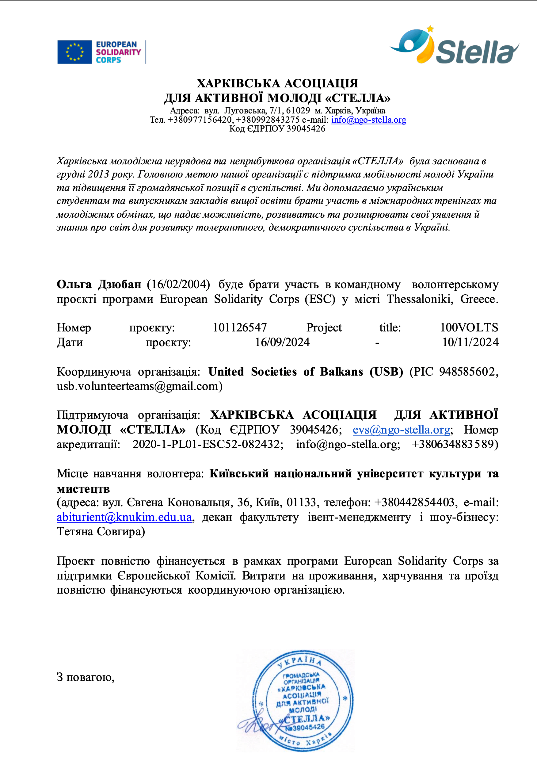 Підтримуюча організація: ХАРКІВСЬКА АСОЦІАЦІЯ  ДЛЯ АКТИВНОЇ МОЛОДІ «СТЕЛЛА» (Код ЄДРПОУ 39045426; evs@ngo-stella.org; Номер акредитації: 2020-1-PL01-ESC52-082432; info@ngo-stella.org; +380634883589)